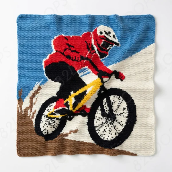 MTB Bike Blanket Pattern Single Crochet (SC) features an action packed mountain bike rider powering through dirt trails in full helmet and gear. Designed in tapestry crochet using SC with bold colorwork detail, this dynamic graphgan captures the thrill of every ride, from rugged mountain paths to fast downhill runs. Perfect for bike lovers, MTB riders, outdoor adventurers, and cycling fans, this afghan makes an eye catching throw for bedrooms, cabins, sports themed spaces, or race day decor. The versatile design also works beautifully as a lapghan for relaxing after a long trail session or as a stroller project for future riders growing up with bikes, helmets, and muddy adventures. A must have pattern for anyone who lives to ride, chase dirt, and conquer the mountain.